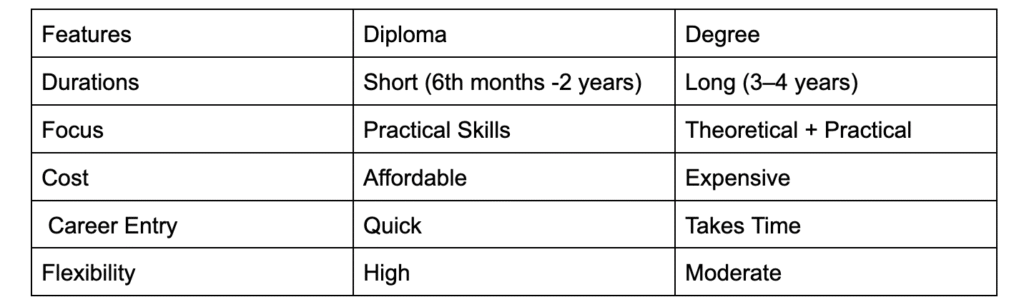 Diploma courses are significantly shorter in duration compared to degree programs. This enables students to join the workforce promptly and begin earning sooner.